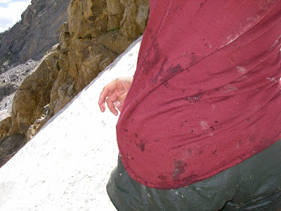 The area where the snow/ice met the rock was a really tall wall/drop off. I kept looking for a place to get on the glacier. I chose a crumbly 15 ft? down climb. Once I hit bottom, I stood in what I guess was a baby bergschrund and climbed onto the Middle Teton Glacier. It was slippery. Having a big pack on was annoying.Next year, I plan on seeing real live crevass(es). In person.